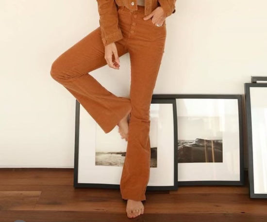 Indulge in luxury with the Andrea Flare Velvet Pants. Crafted from soft Light Brown velvet and accented with four buttons, these pants exude sophistication and elegance. The high waist and flare bottoms create a flattering silhouette, perfect for any occasion.