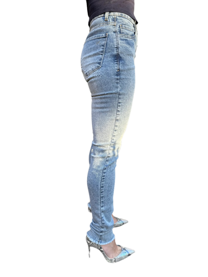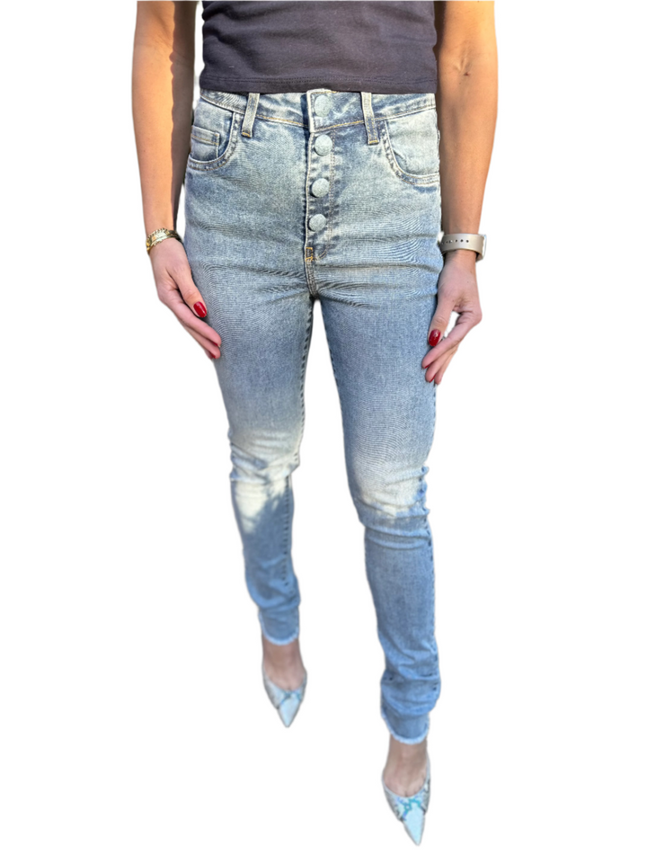 Elevate your wardrobe with the luxurious style and sophistication of our Andrea Skinny Pants. Crafted in a light blue wash with unfinished bottoms, these high-waisted pants are adorned with four denim buttons for an exclusive and refined look. Embrace the elegance and versatility of this must-have piece.