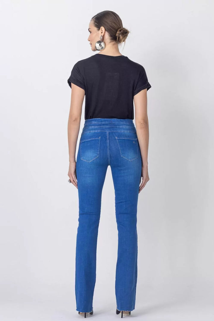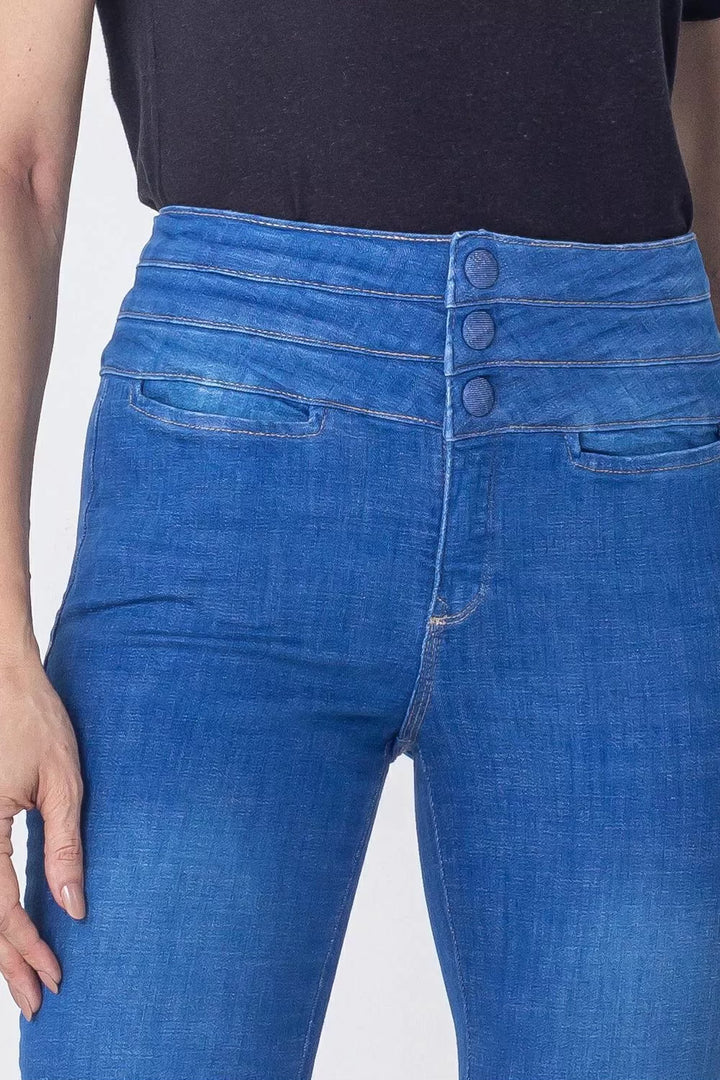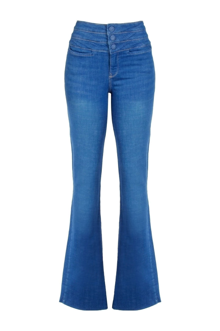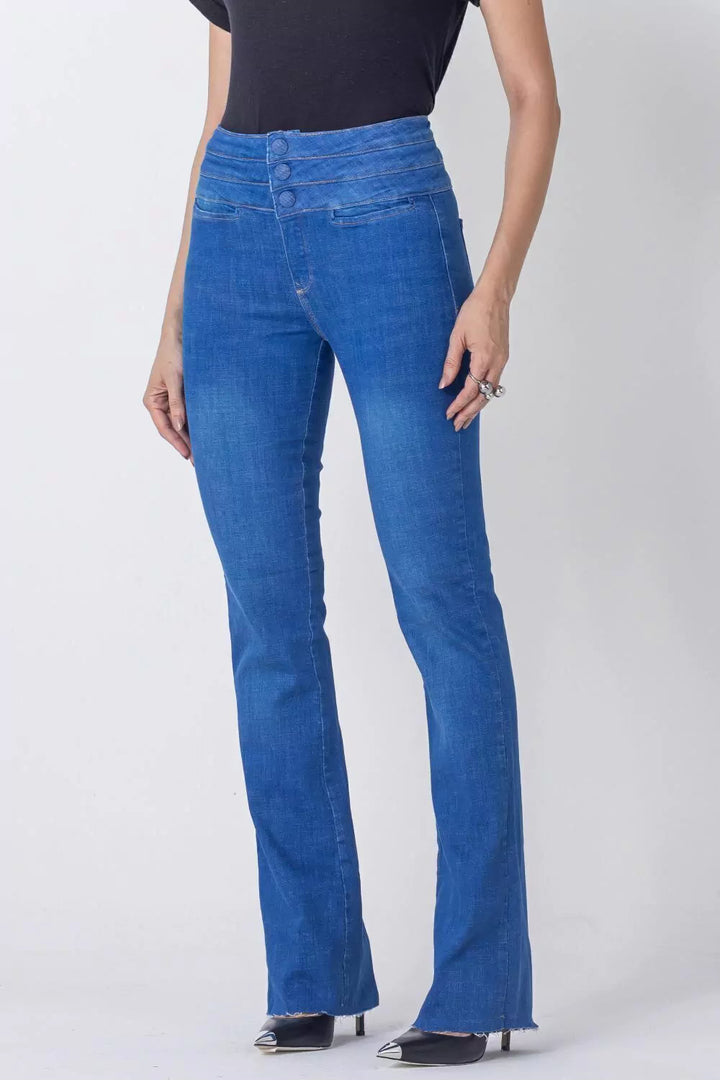 Elevate your style with the Andreza Flare Jeans. These long pants feature a unique triple waistband and 3 denim buttons, adding an elegant touch. The unfinished bottoms offer a chic, casual look. Perfect for those who want to exude confidence while maintaining a casual vibe.