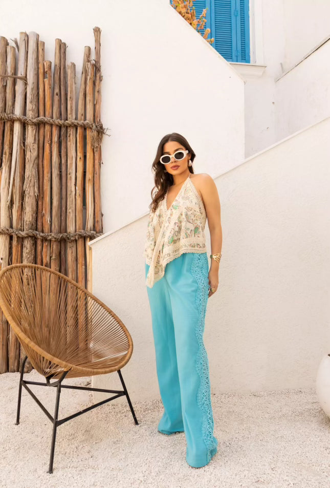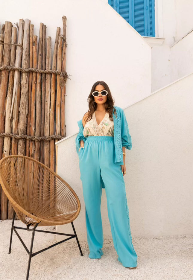 Upgrade your wardrobe with our Bruna Pants. These luxurious turquoise blue pants feature delicate lace details, adding a touch of elegance to your look. Perfect for any occasion, these pants will elevate your style and make you stand out in a crowd.