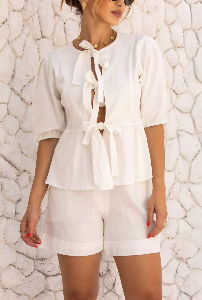 The Erika Blouse: a stylish and versatile addition to any wardrobe. This blouse features playful bows, adding a touch of whimsy to any outfit. Perfect for a fun and flirty look, or to add a pop of personality to a professional ensemble.