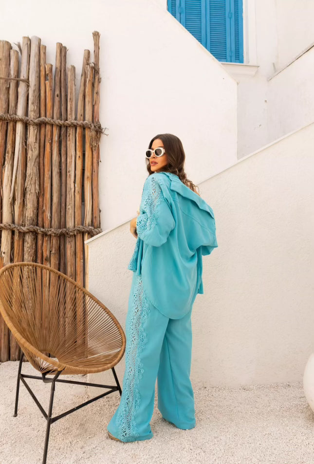 Elevate your style with our luxurious blue cotton shirt accented with delicate lace details. Crafted with premium materials, this shirt offers both comfort and sophistication. Perfect for any occasion, make a statement with this exclusive piece.