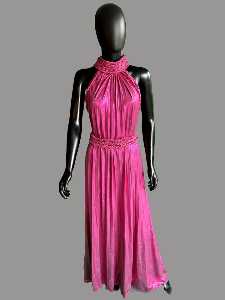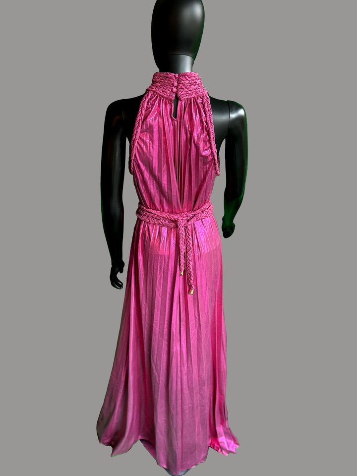 Indulge in the luxury of our Long Metallic Dress, crafted from orchid pink metallic fabric. Its high neck and waist-cinching rope create a sophisticated silhouette. Elevate your style and exude elegance in this exclusive piece.