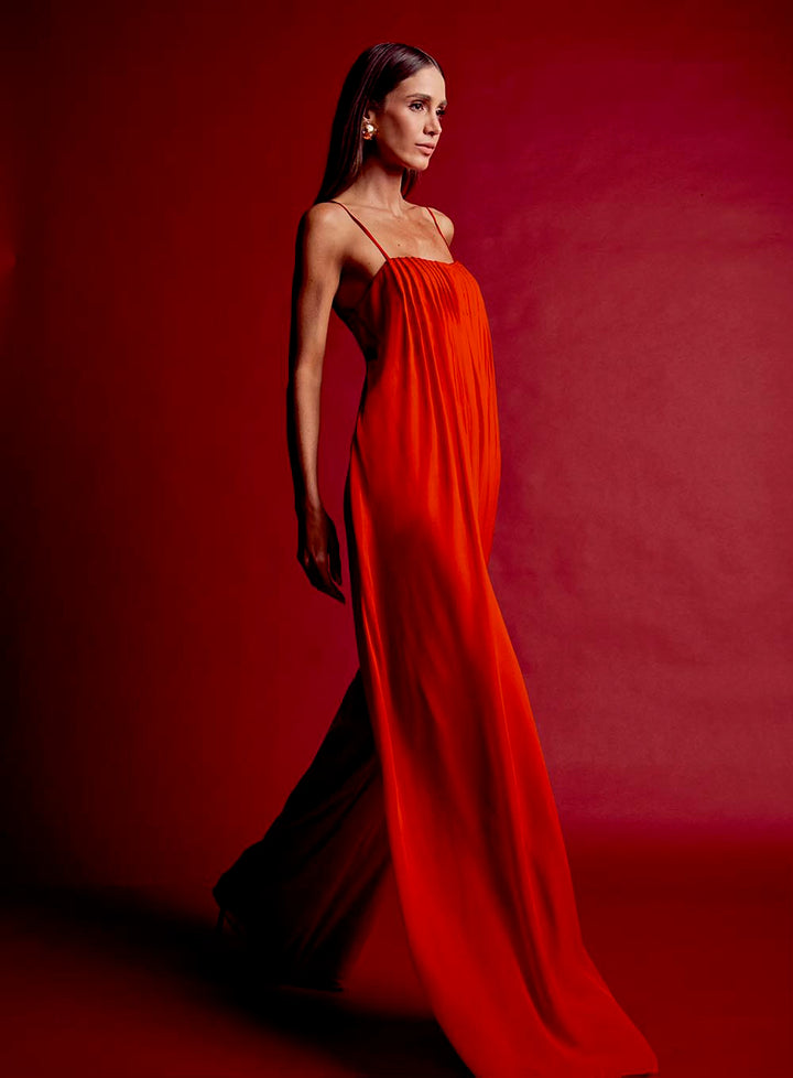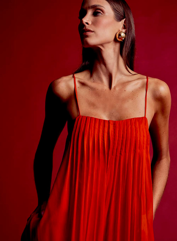 Introducing the Mariah Jumpsuit, a statement piece for any holiday party. Crafted from flowy fabric, pleated top and with wide pants, this striking red jumpsuit is sure to make heads turn. Elevate your style and make a lasting impression with this stunning piece.