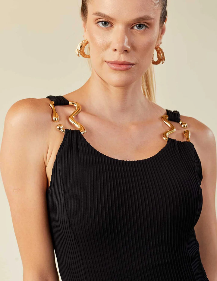 Upgrade your swim game with our Premium Swimsuit Texture Black Metal Details. This one-of-a-kind piece exudes luxury and comfort with its black texture and buckle details. Get ready to turn heads at the pool or beach with this exclusive swimsuit.