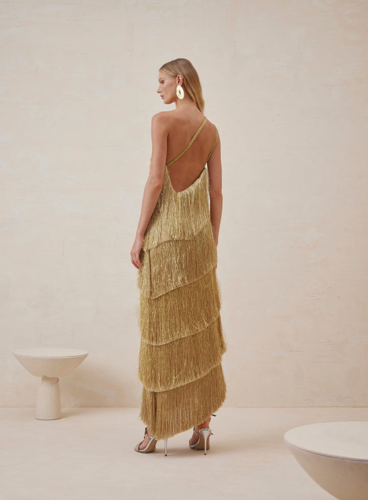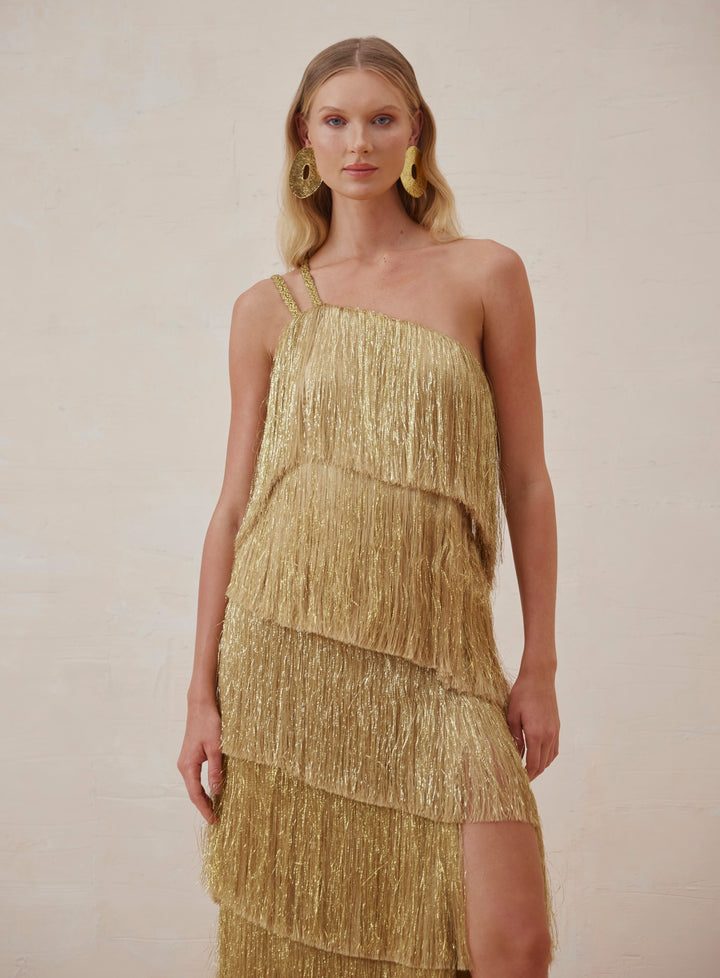 Indulge in the opulent glamour of the Tassia Dress. Adorned with stunning gold fringes, its asymmetrical top and double straps on one side exude sophistication. A sleeveless design and side slit add a sense of allure, making it the perfect choice for any special occasion.
