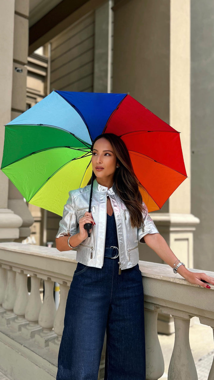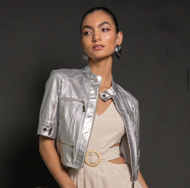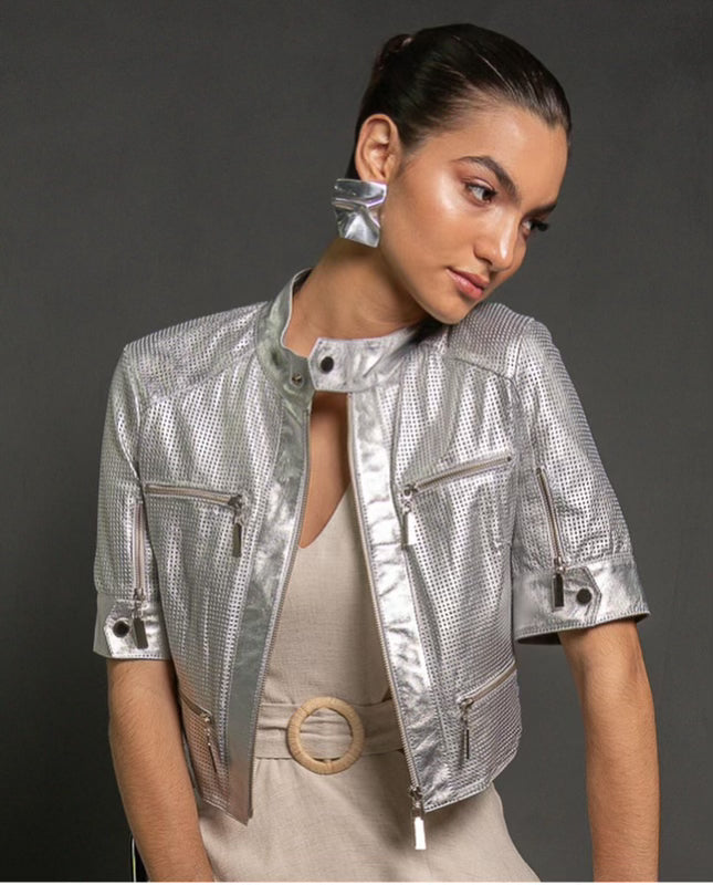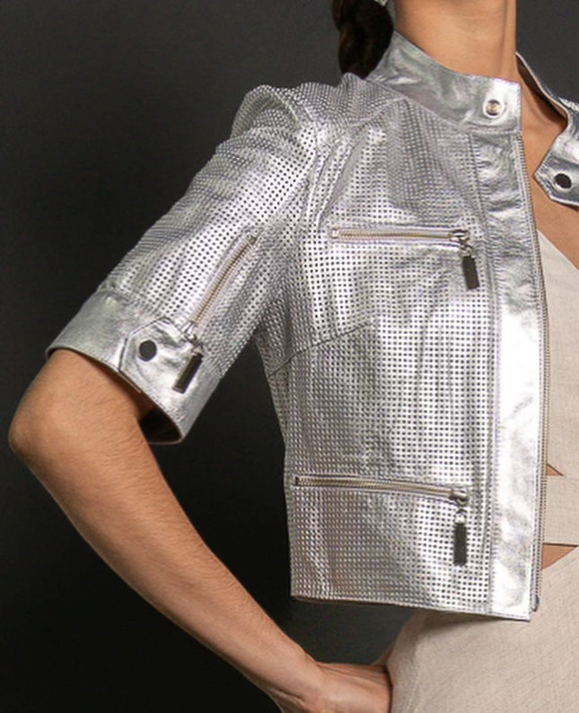 Introducing The Mini-Jacket, a sophisticated and exclusive addition to your wardrobe. Made with laser cut Pelica metallic leather, this mini-leather jacket features 3/4 sleeves for a touch of elegance. Elevate your style with this luxurious and tasteful piece.