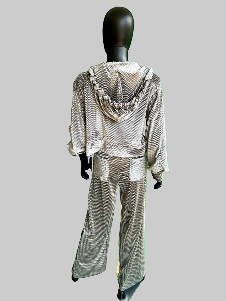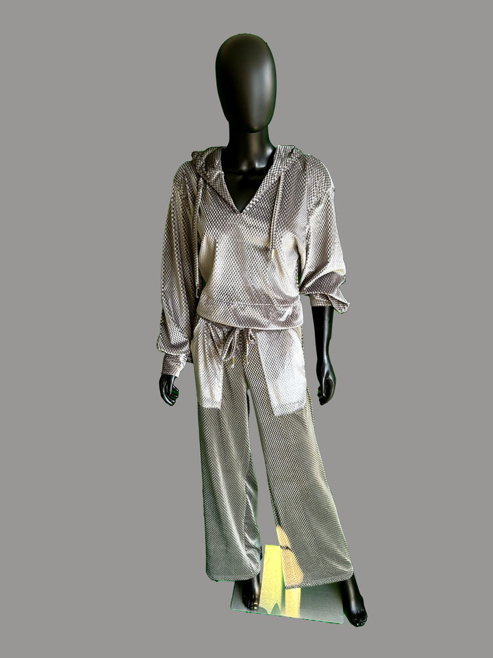 Unleash your inner elegance with our Velvet Set. Made from luxurious gray shiny velvet, this set includes a sweatshirt and pants for ultimate comfort. Perfect for transitioning from day to evening, it's the perfect addition to your wardrobe. Indulge in comfort and style with our Velvet Set.